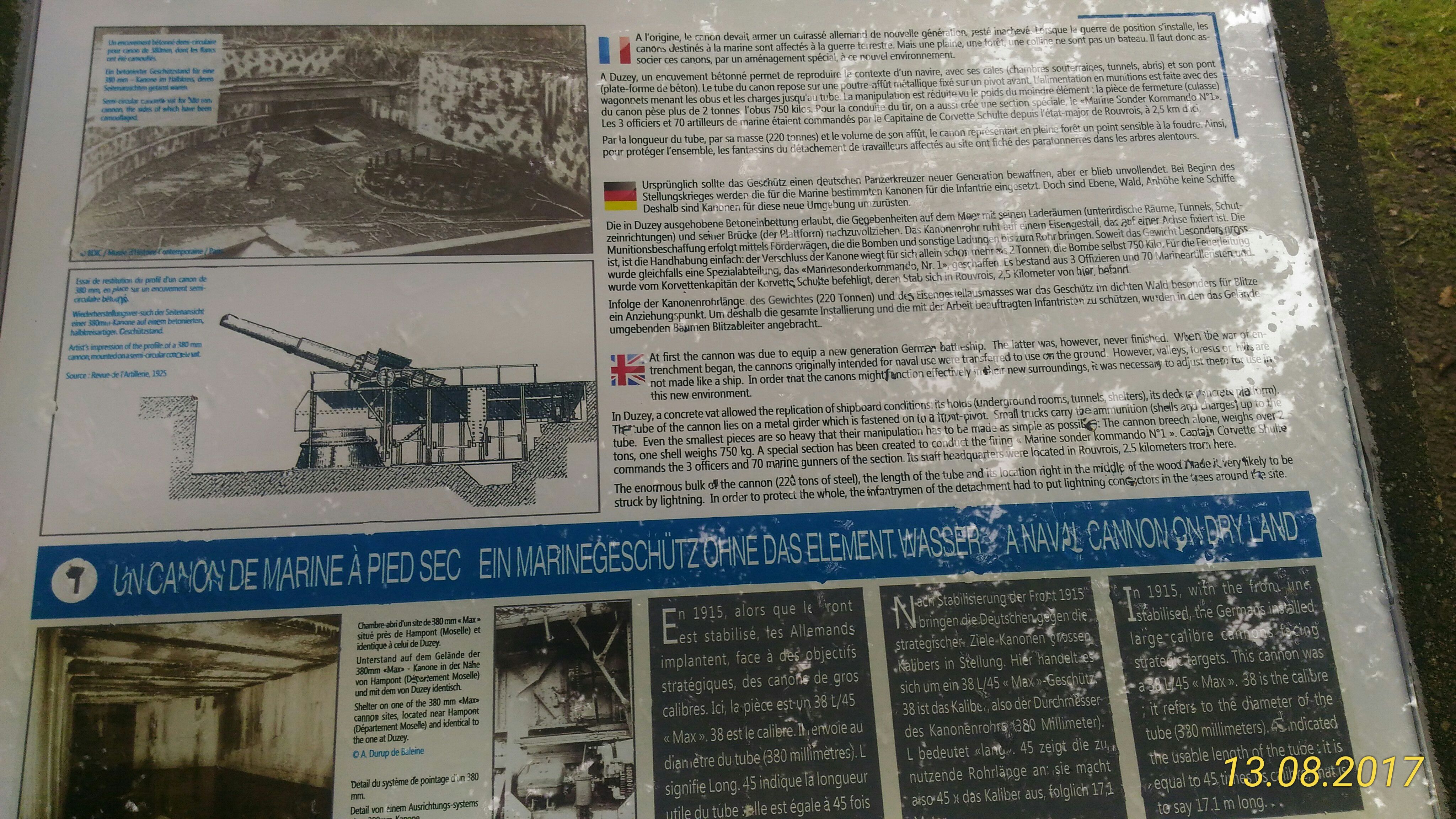 Vous aimez vous promener dans les bois. Vous aimez l'histoire. Et notamment la guerre de 14-18. Vous voulez voir de très beaux vestiges et notamment le fameux canon allemand de 380 mm et son emplacement. Vous devez aller à Duzet en Meuse. Belle sortie.
